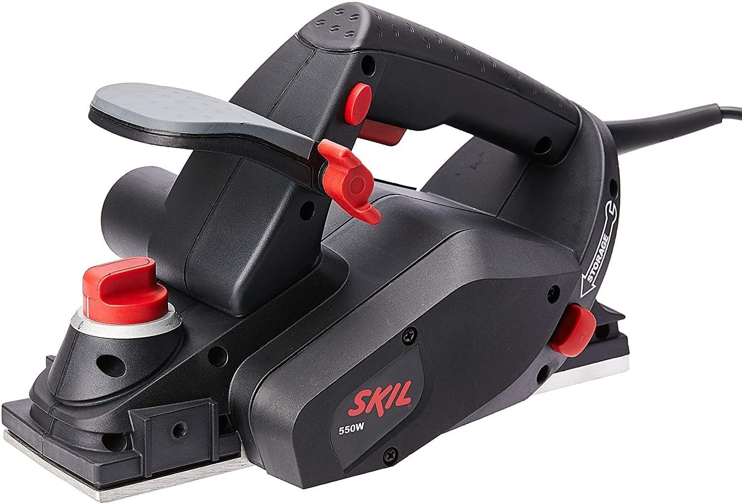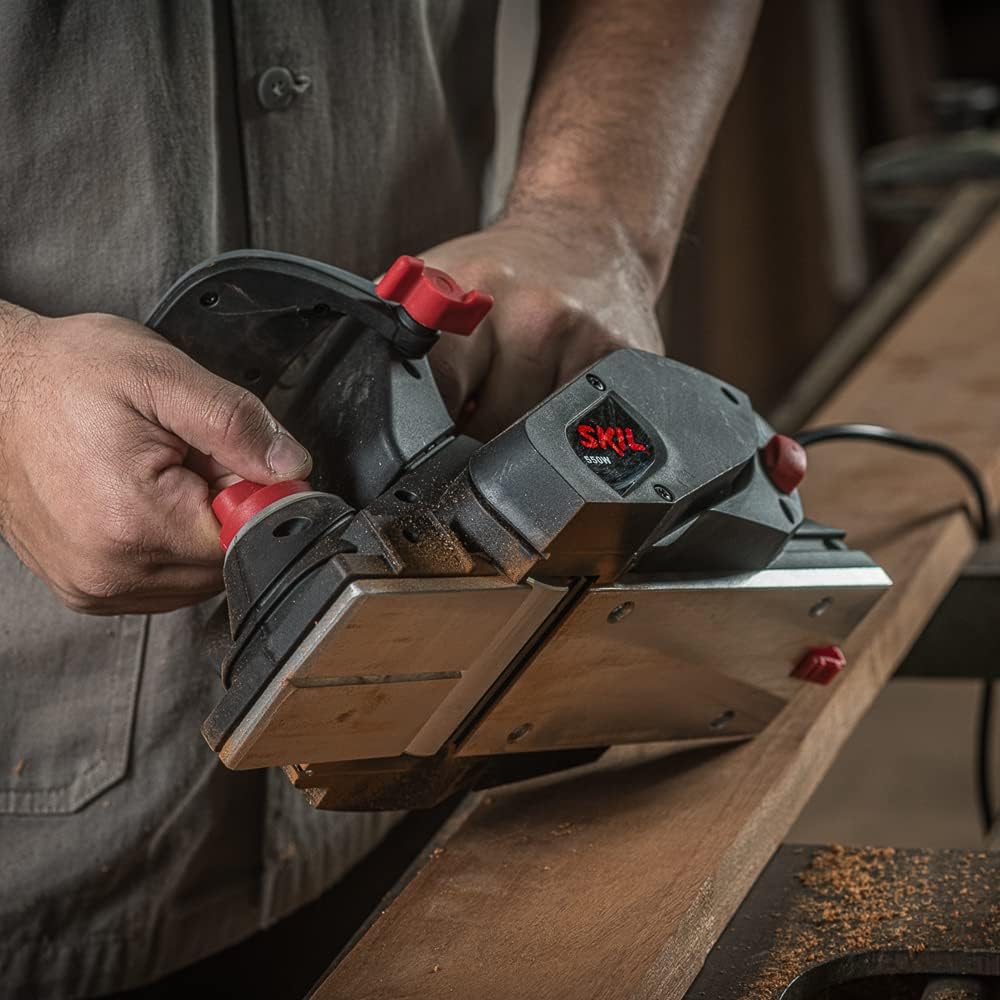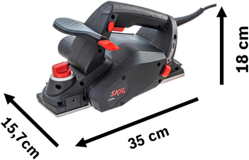 A Plaina Skil 1555, com 550 Watts de Potência, oferece facilidade para aplainar as superfícies de madeira e derivados sem esforço, pois possui duas facas para remoção de material, o acabamento é perfeito, pois conta com base em alumínio e mecanismo de ajuste de profundidade de corte de até 1,5 milímetros, para garantir ainda mais o serviço ela dispõe de pé de apoio na parte traseira da ferramenta para não danificar as facas e a superfície trabalhada, sua empunhadeira auxiliar é emborrachada e ajustável para maior conforte ao usuário.